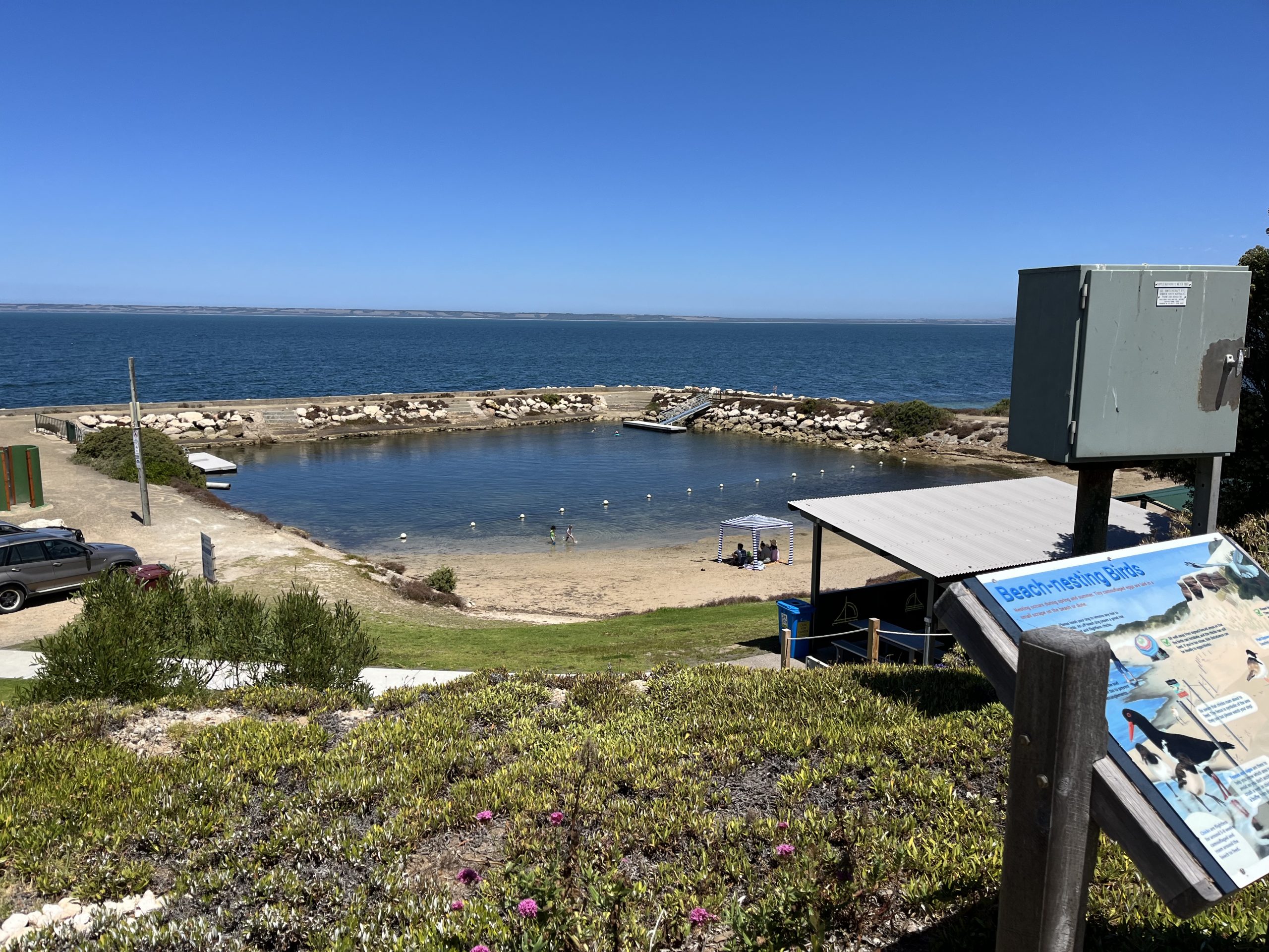 After Melbourne, in the state of Victoria, we flew to the state of South Australia and via its capital, Adelaide, to Kangaroo Island, where we spent a few days reveling in nature experience vs. urban adventures. One might compare the island to Wisconsin’s Door County (except that’s a peninsula) or Cape Cod, but way less gentrified, despite wineries, a few small towns, and beaches. We stayed in Kingscote, the biggest town on the island. Our modest hotel faced the sea, and there was a path alongside the water to the business area of the town about a kilometer away. On our first foray after arriving, we discovered a swimming pool built as a tide pool of the ocean. Of course, I had to try this unique spot. It was a great swim.