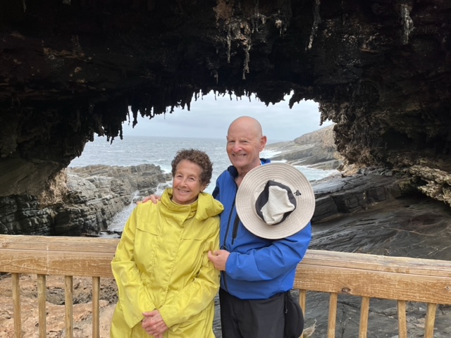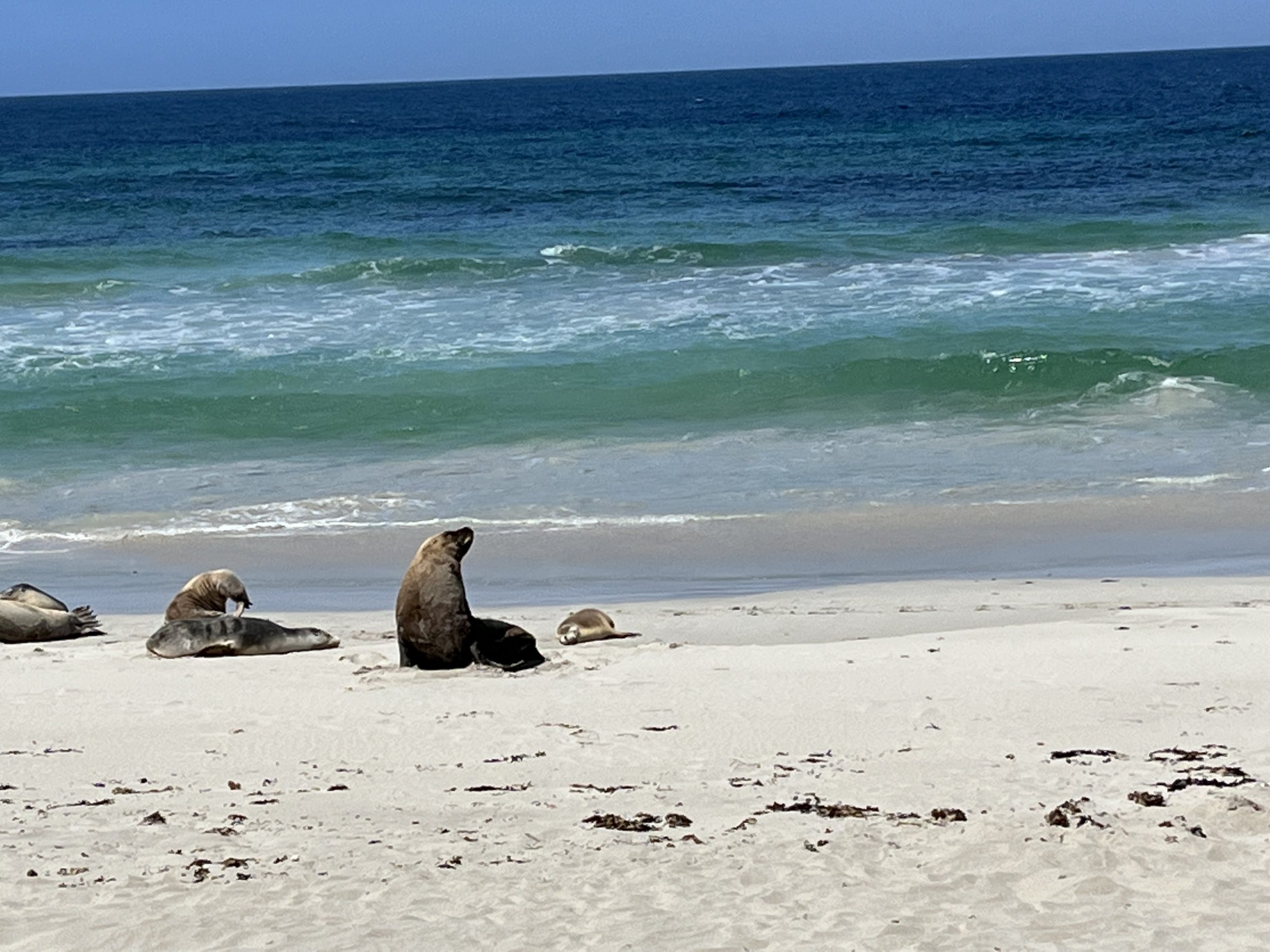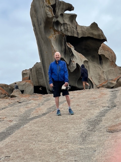 At 9 am the next morning, we started a full (and I do mean full) day experiencing the rest of the island with our guide, Luca, an Italian resident who came to Australia after meeting his wife when she was a student in Italy. Along with just three others–a young couple from Switzerland and an Australian guy on holiday–we set off to see, walk, hike, and climb amazing places–until 7 pm. The variations in topography and climate reminded us of Northern California: from a forest-like home to koalas and kangaroos (too elusive to interview), to seal lion beach enclaves under warm sun, to clouds and chilly wind at Admirals Arch and Remarkable Rocks. On and off went our sunglasses and jackets! We circumnavigated the whole island with pleasant companions and Luca’s excellent narration. He even cooked a barbecue chicken skewer lunch at one stop. One of the most delightful guides we’ve ever had anywhere.