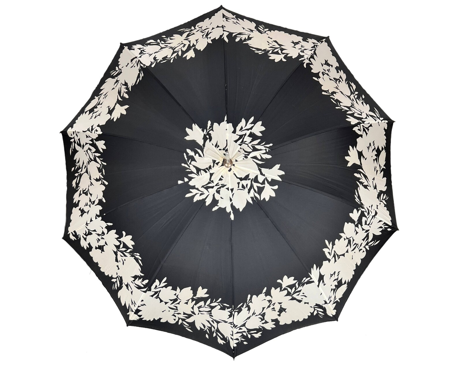Vintage 1930s Umbrella Black w White Floral Print & Black Bakelite Handle IGRA–found on etsy.com