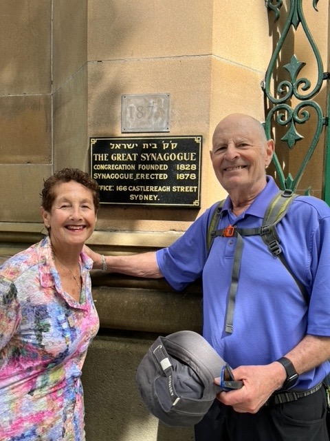 Outside the Great Synagogue, only open on Shabbat and holidays, across Hyde Park (yes, there’s one in Sydney, too) from a huge cathedral.