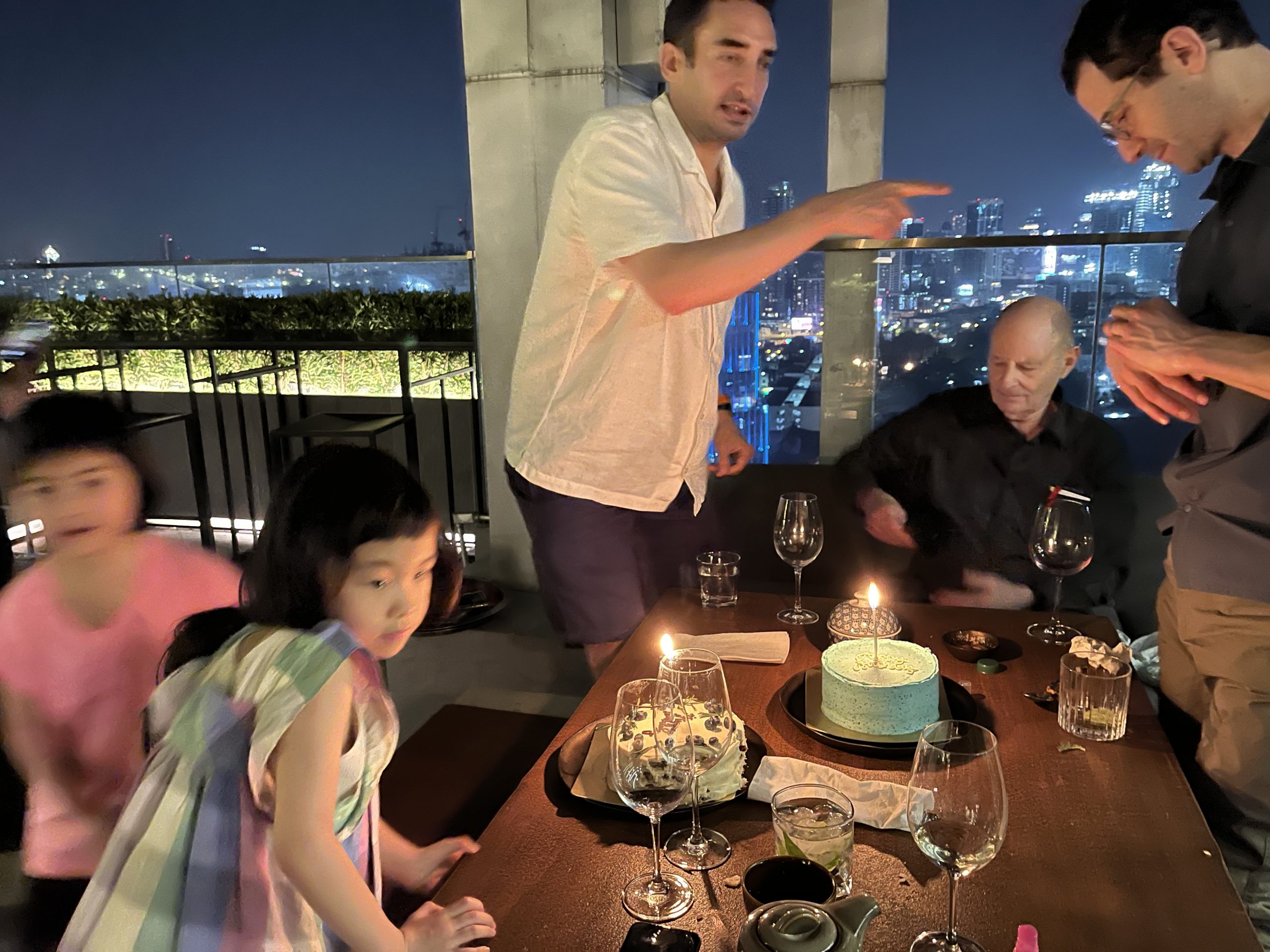 Birthday party 28 floors up in Bangkok: Mirah and her pal MioMio; new dad Harold making the point he’s younger than Jonathan. Sorry for blurry photo.